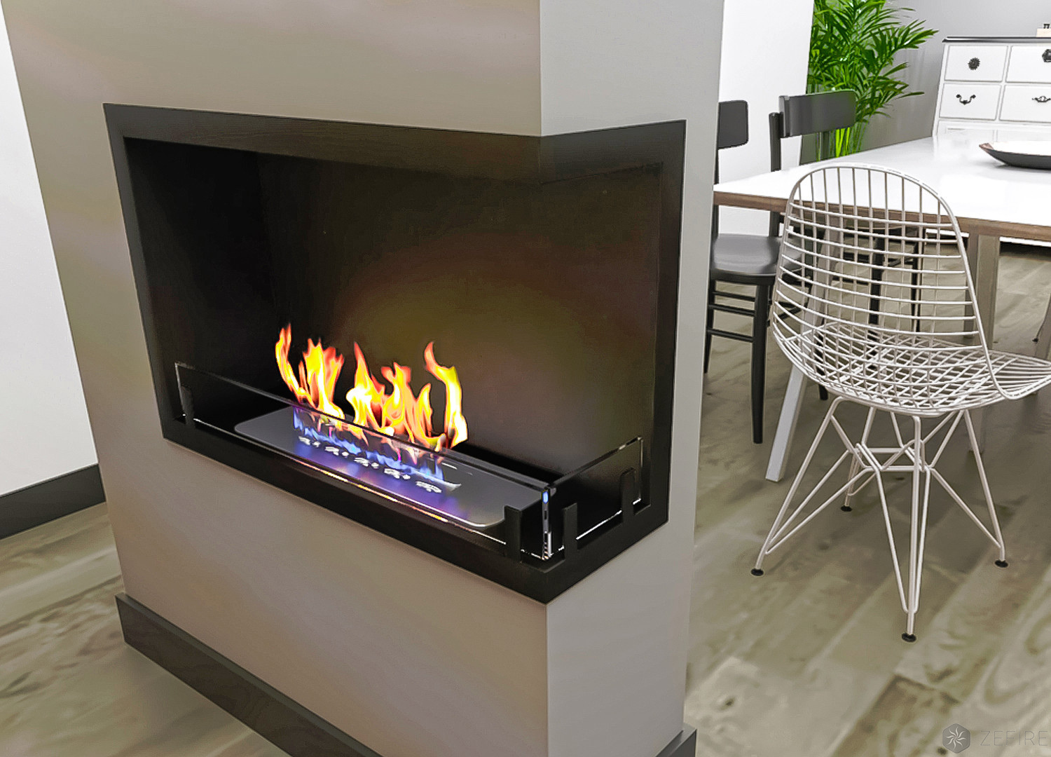 Встраиваемый очаг открывает живое пламя с двух сторон: впереди и справа. Он имеет увеличенный угол обзора и при этом не отнимает полезной площади помещения. Инсталлировать огненный декор можно в любые ненесущие конструкции: межкомнатную перегородку, выступающий угол или колонну, короб из гипсокартона или шкаф из МДФ.