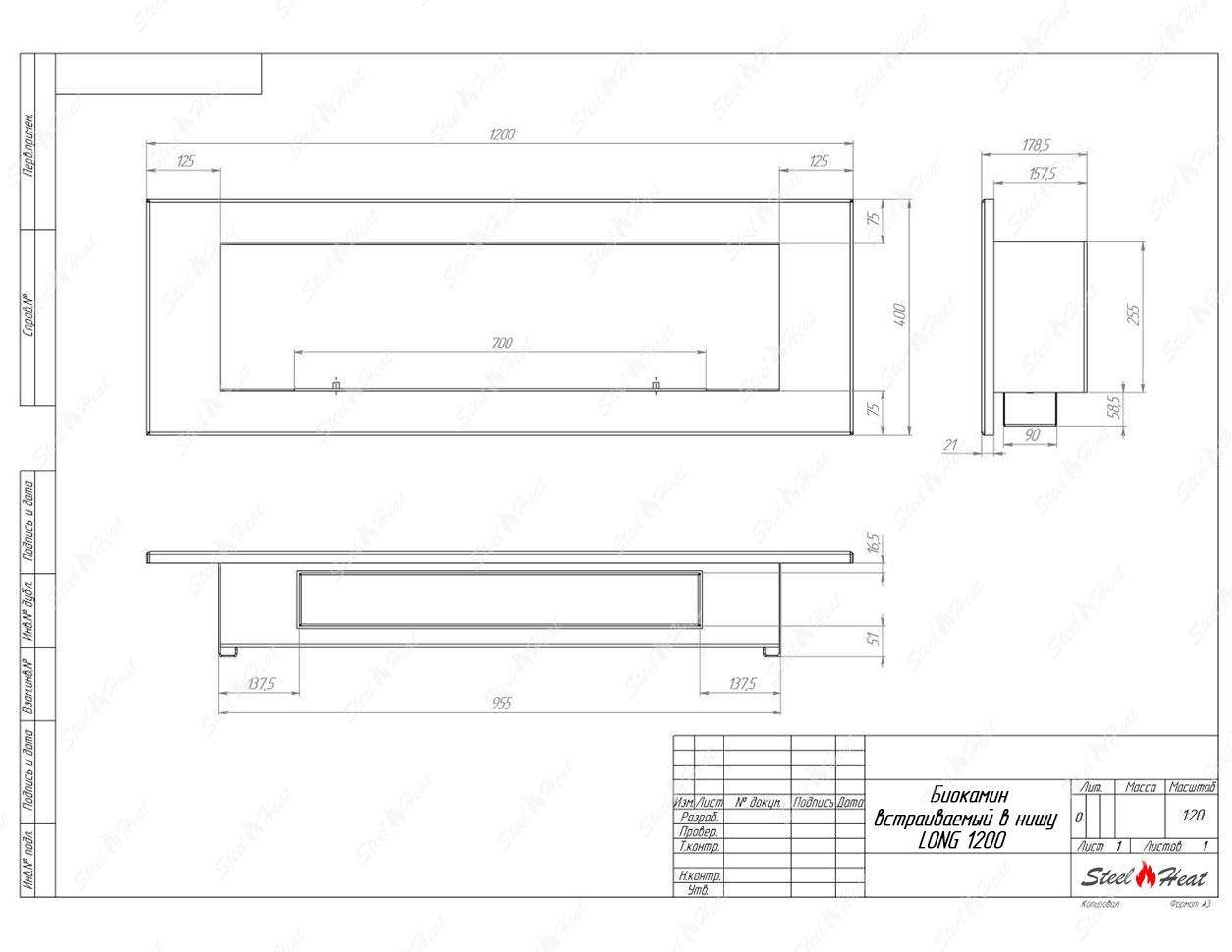 Встраиваемый Биокамин SteelHeat LONG-H 1200 предназначен для встраивания в глухие ниши из гипсокартона, кирпича, пеноблоков, бетона.