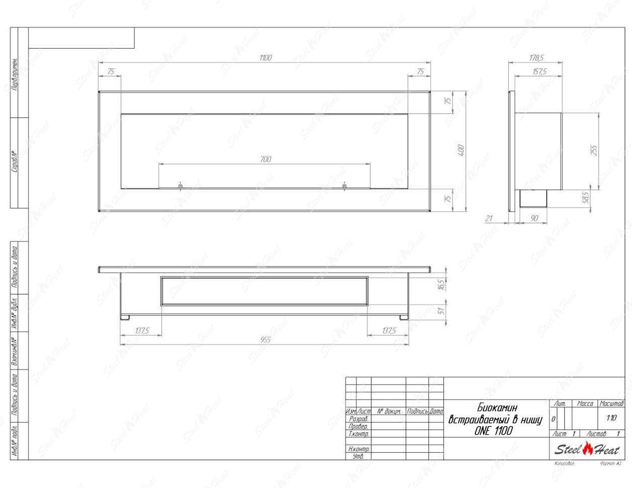 Встраиваемый Биокамин SteelHeat One 1100 предназначен для встраивания в глухие ниши из гипсокартона, кирпича, пеноблоков, бетона.