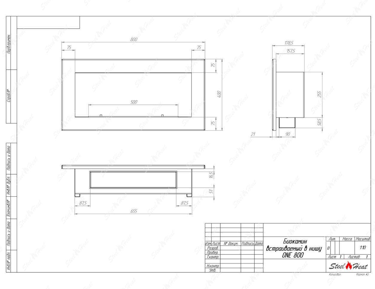 Встраиваемый Биокамин SteelHeat One 800 предназначен для встраивания в глухие ниши из гипсокартона, кирпича, пеноблоков, бетона.