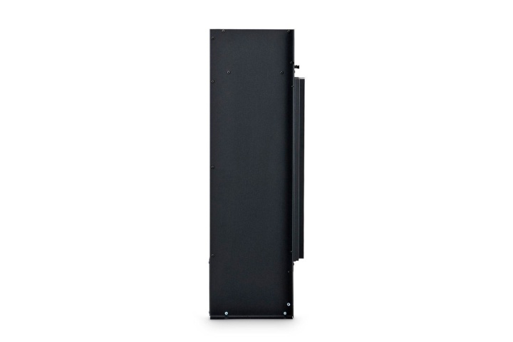 Дрова, охваченные огнем, прекрасно дополняет дизайн камина. Узкий вытянутый корпус черного цвета смотрится элегантно и подчеркивает красоту безудержного ярко-оранжевого пламени.