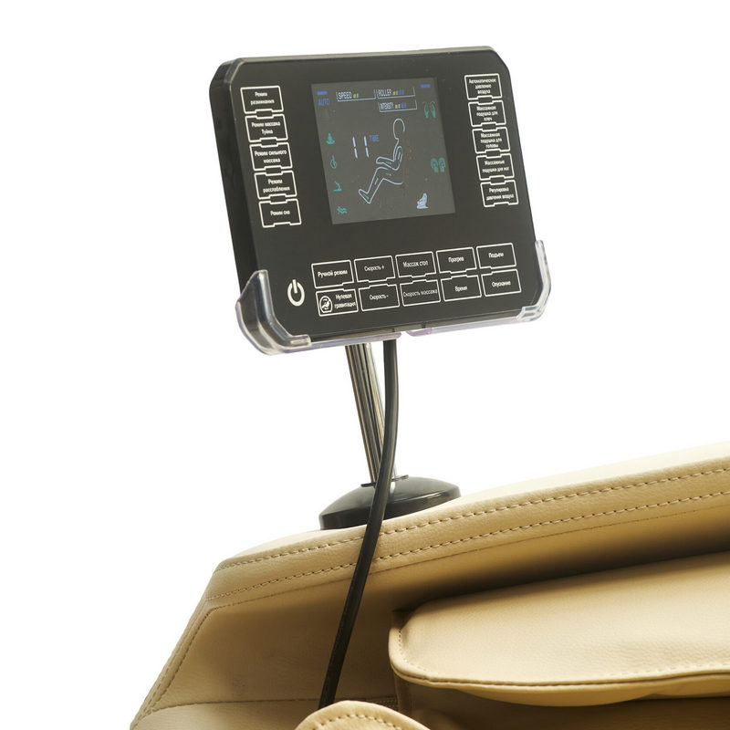 Регулировка под рост - с помощью этой функции кресло подойдёт людям с разным ростом., Невесомость (Zero-G) - кресло принимает положение, при котором ноги находятся выше уровня головы. При таком положении происходит максимальное расслабление и прорабатывание более глубоких тканей роликовым массажем., Раскачивание - во время массажа, кресло совершает плавные покачивающие движения., Слайдер - благодаря данной функции устройство можно ставить практически вплотную к стене и не беспокоиться, что при начале массажа, спинка кресла упрётся в стенку., Музыка - подключение к креслу по Bluetoth для прослушивания Вашей любой музыки во время массажа., Прогревание - с помощью инфракрасного прогрева происходит расслабление мышечных тканей, за счёт чего массаж становится ещё более эффективен. |