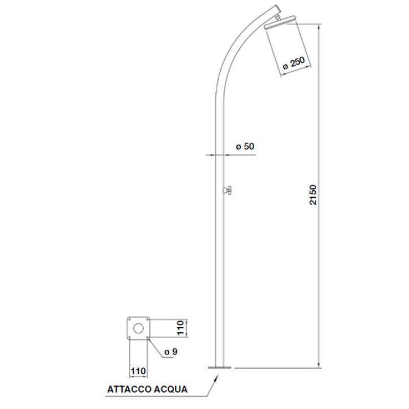 Высота 2250 мм.; Диаметр лейки 250мм.; Один режим "дождь".
